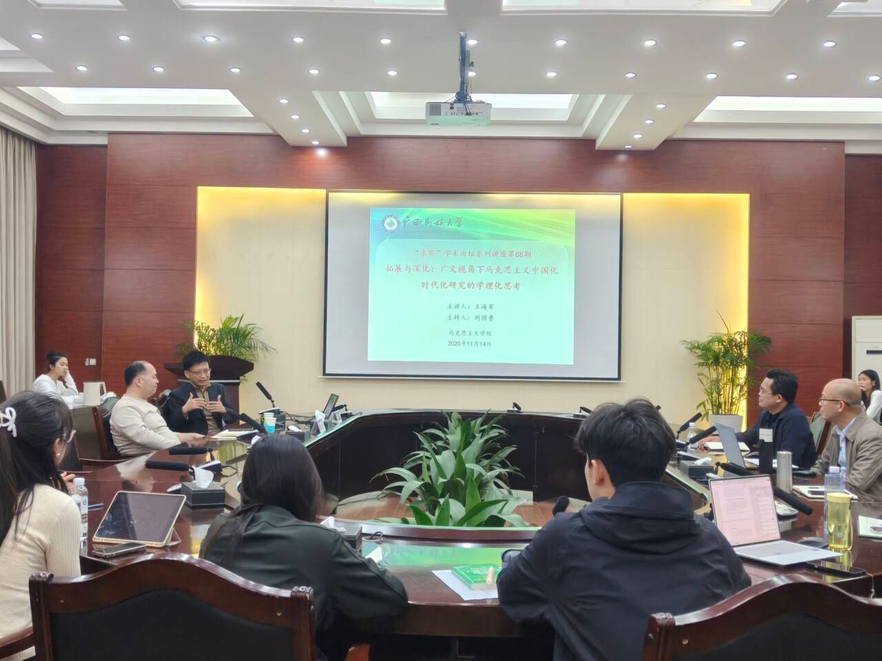 11月14日,中国人民大学中共党史党建研究院王海军教授受邀我校于国交处大会议室作“拓展与深化:广义视角下马克思主义中国化时代化研究的学理化思考”的学术讲座,本次讲座由我院副院长刘国普主持,部分教师与2024级研究生、2023级本科生同学参加。