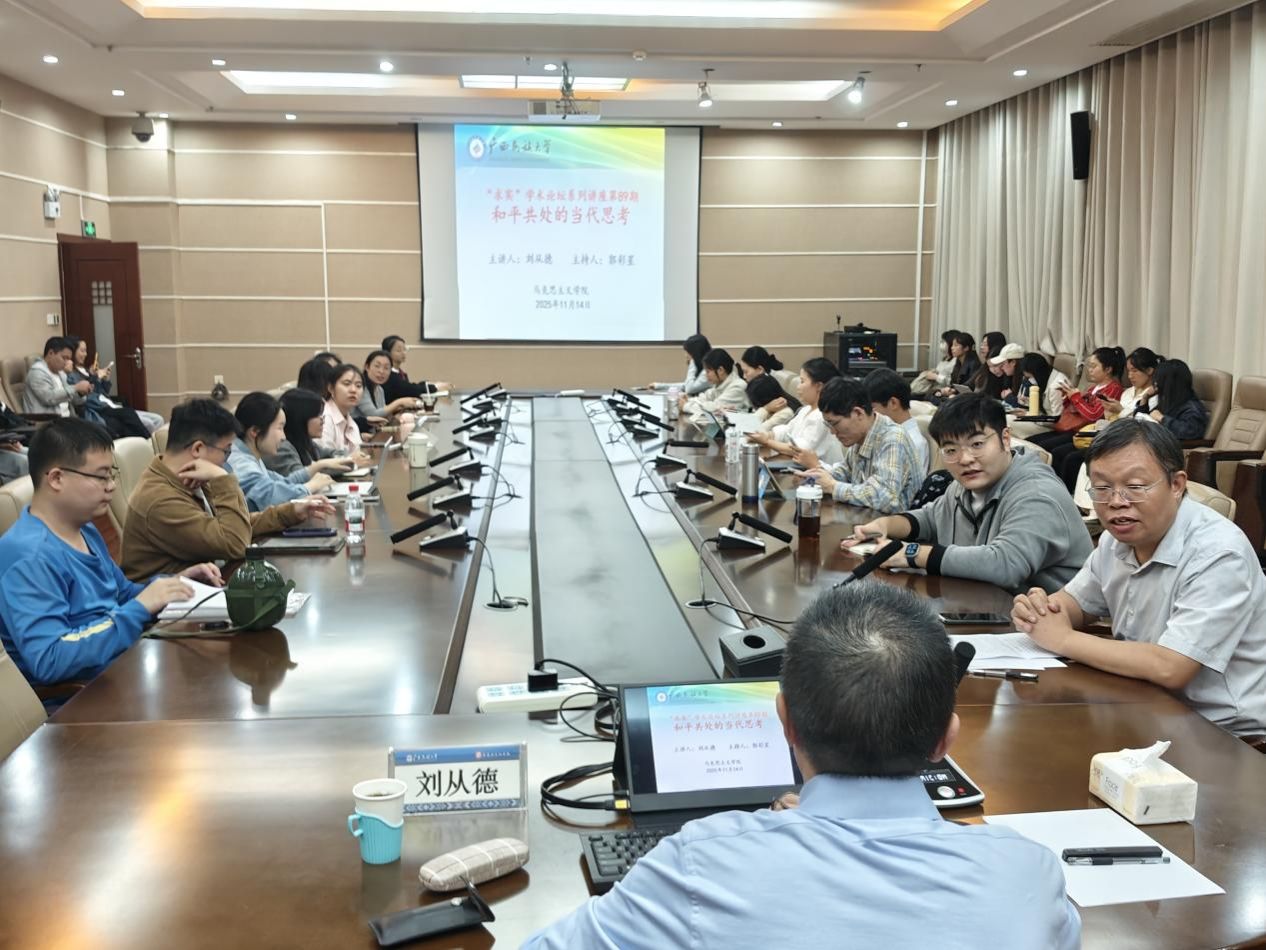 11月14日,马克思主义学院“求实”学术论坛系列讲座第89期--“和平共处的当代思考”于国际教育综合楼会议室顺利举行。本次讲座邀请华中师范大学刘从德为教授主讲人,由学院郭彩星教授主持本次会议。学院部分教师与部分研究生共同参与了本次讲座。