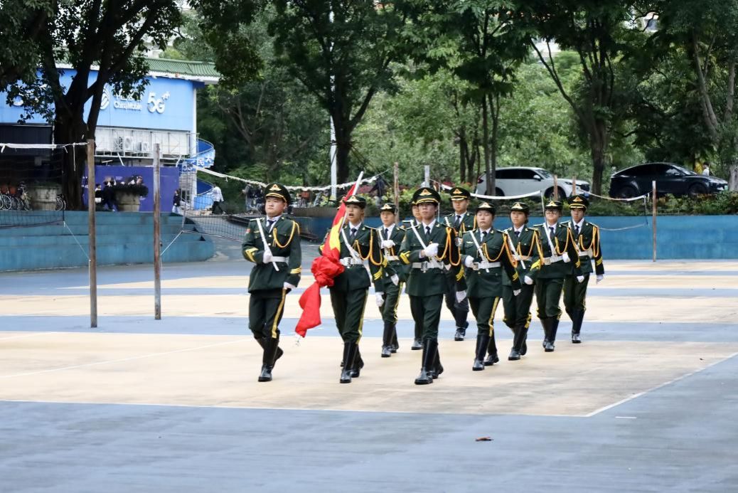 仪式开始,国旗护卫队迈着坚定一致的步伐,护卫五星红旗走向升旗台并进行升旗。全体师生面向国旗行注目礼,高唱国歌。