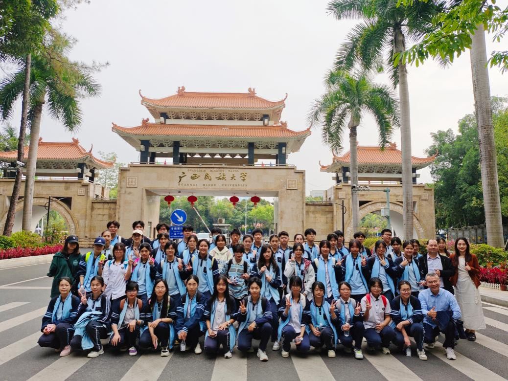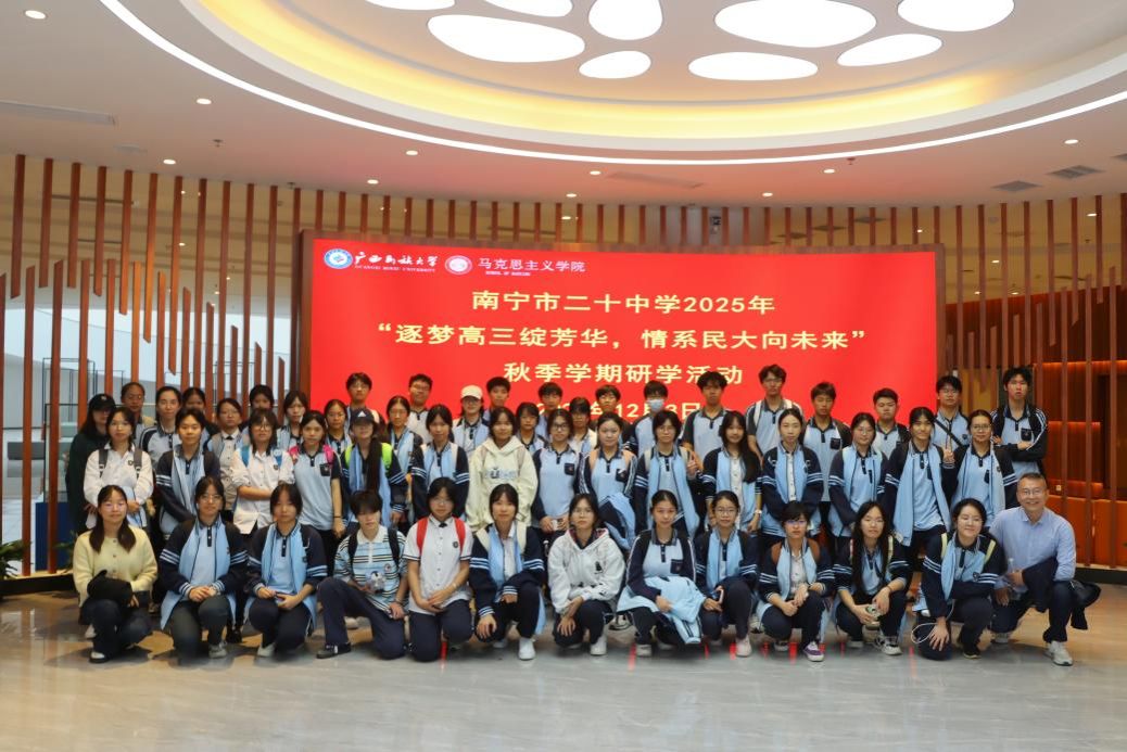 12月3日下午,我院校外导师、南宁市第二十中学副校长付松锋带领南宁市第二十中高三学子一行54人走进广西民族大学开展研学活动。我院副院长刘国普、教师代表梁桂云以及2024级、2025级学科教学(思政)专业学生志愿者们热忱相迎。此次研学活动旨在铸牢中华民族共同体意识,推动大中小学思政课一体化建设落地见效,助力青年学子成长为有理想、有本领、有担当的时代新人。