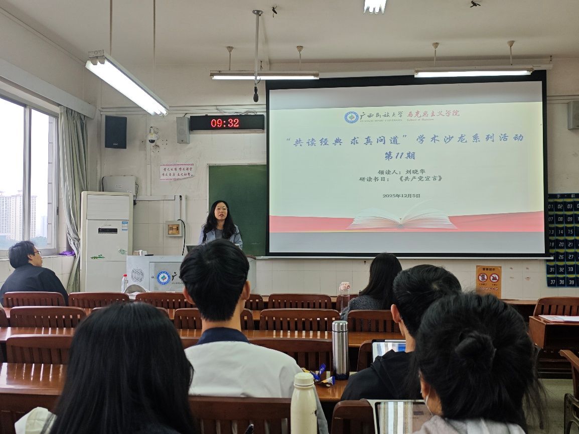 12月5日上午,马克思主义学院“共读经典 求真问道”学术沙龙系列活动第11期在校友楼602室顺利举办。本次活动由刘晓华老师领读《共产党宣言》,2024级研究生参加。