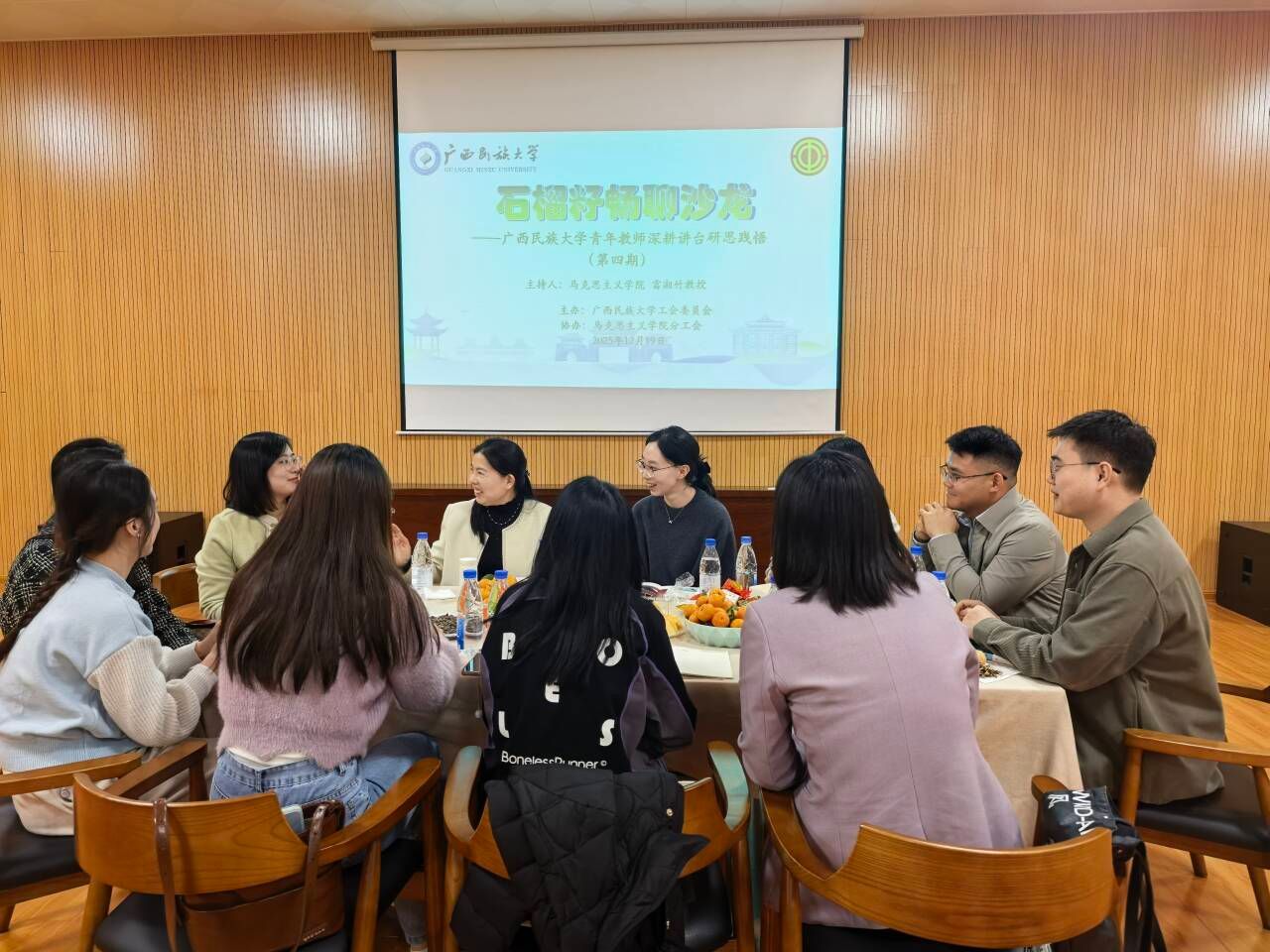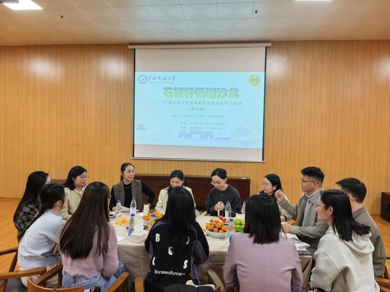 为搭建经验交流桥梁、助力青年教师专业成长,12月19日下午,由校工会主办,马克思主义学院分工会协办的第四期“石榴籽畅聊沙龙”在八坡教职工活动中心顺利举行。本期沙龙以“深耕讲台育桃李 研思践悟强本领”为主题,由校工会副主席黄兰红主持,特邀马克思主义学院雷湘竹教授担任分享嘉宾,学院十余名青年教师代表参与交流,共同探讨教学科研心得,破解职业发展困惑。