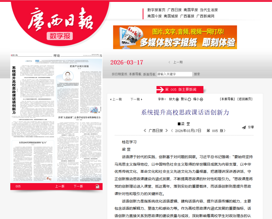 【成果推介】我院梁罡教授在《广西日报》发表理论文章:系统提升高校思政课话语创新力
